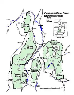 Established in 1908 from the merging of Fish Lake National Forest and Glenwood National Forest, the forest covers 1.5 million acres (6,100 km2) and is split into four districts. The forest lies in parts of nine counties. In descending order of forestland area, they are Sevier, Millard, Piute, Beaver, Wayne, Juab, Garfield, Iron, and Sanpete counties. Forest headquarters are located in Richfield with local ranger district offices in Beaver, Fillmore, Loa, and Richfield.[6] The national forest is the headwaters of Otter Creek, a tributary of the East Fork Sevier River. It is also home to the Chalk Creek Hieroglyphics.
