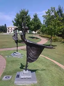 The Five Moons sculpture was unveiled at the Tulsa Historical Society in November 2007. The sculptures present each of the women in a costume and pose representative of one of their signature roles.[16] The project was begun in 1995 by artist Monte England. England, inspired by Mike Larsen's mural, desired to create a tribute in bronze to the ballerinas in his hometown of Tulsa.[17] Sponsorship of the project was provided by Tulsa Historical Society and the Tulsa Ballet, whose representative monitored the project to help England ensure that details such as hand position and dress were accurate. In 2005, however, England died, having completed only two of the full-sized sculptures. England's long-time friend and fellow sculptor Gary Henson was asked to complete the project. Henson was provided license by the Ballet and Historical Society to complete the remaining sculptures in his own style, which differed slightly from that of England.