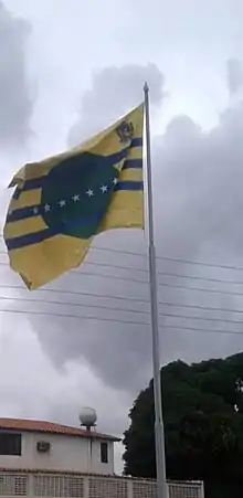 The flag of Bolívar State was designed by cinetic artist Jesús Soto. It is composed by three colors: the yellow field, representing the riches of the state. Over the yellow field, a green circle, representing the abundant vegetation and three blue fesses separated from each other to represent the rivers that cross the Bolívar State.