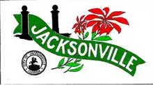 The current flag of Jacksonville was adopted by the Jacksonville City Council on 24 February 1976. It was designed by Don Bozeman, winner of a design contest prior to the 1975 Bold CityFest, the annual celebration of the city/county government consolidation.[1] The city's previous flag, designed by Edmund Jackson and adopted in 1914, was considered outdated.[2]