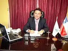 Marcelo Cabrera, mayor of Pichilemu, in his office. The flag of Pichilemu can be seen on his table.