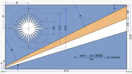 The flag has a ratio of 10:19. The star is situated such that its center is equidistant from the left edge, the top edge, and the top of the orange ray.