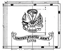 | Design | A blue replica of the War Office Seal set on a white field. Beneath the seal is a broad scarlet scroll bearing the inscription in white letters, "UNITED STATES ARMY". Beneath the scroll, in blue sans serif Arabic numerals, is "1775". |