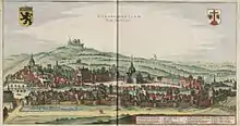 The town of Geraardsbergen with the Abbey of Saint Adrian. Hand coloured etching from Flandria Illustrata
