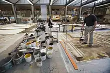 Broadway or stage flats are generally constructed of 1-by-3-inch (25 mm × 76 mm) nominal (3⁄4 by 2+1⁄2 inches or 19 by 64 millimetres actual) pine boards. The boards are laid out flat on the shop floor, squared, and joined with the keystones and corner blocks. The keystones and corner blocks are inset 1 inch (25 mm) from the outside edge, which allows for flats to be hinged or butted together. They are then glued in place, and stapled or screwed down. The flat can then be flipped over and covered with muslin or decorative plywood. Toggles in a Broadway flat are placed on 4 ft (1.2 m) centers.