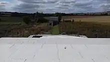 The house rises directly from a planned but seemingly natural tangled wilderness of indigenous grasses and wild flowers. The roof's stepped design incorporates small rectangular pockets designed to be easily colonised by indigenous plants seeding naturally on the wind; this, in time, combined with the naturally occurring mosses and, in time, weather-worn stone steps of the roof, will further permit the building to blend into and be absorbed by the landscape.[6]