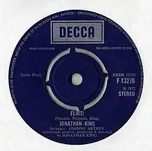 "Flirt!" is a song and single written by Jonathan King, Michel Delpech and Roland Vincent and performed by King.[1] Released in 1972 it reached 22, on the UK charts, staying there for nine weeks.[2][1] The song is a cover of a French song, Pour un Flirt, by Delpech and Vincent, to which King added English lyrics.[3]