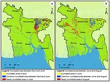In 2017, unpredicted early heavy rain caused flooding in several parts of Bangladesh and damaged pre-harvested crops in April. The April flood continued until the last week of August and caused substantial damage to housing, property, and infrastructure. Inundation maps of Bangladesh for March, April, June, and August 2017, based on Sentinel-1 images, show that in March 2017 perennial waterbodies covered 5.03% of Bangladesh. In April, a total flood-inundated area was 2.01%, most inundation occurring in cropland (1.51%), followed by rural settlement and homestead orchard areas (0.21%) and other areas (0.29%). Similarly, more area was inundated during the catastrophic June and August months, with inundation covering 4.53% and 7.01%, respectively.[10]