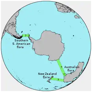 The work's author, Hooker, gave Charles Darwin a copy of (a draft of) the Flora; Darwin thanked him, and agreed in November 1845 that the geographical distribution of organisms would be "the key which will unlock the mystery of species".[20] To explain the presence of plant groups on the widely-separated landmasses of Australia, New Zealand, and southern South America, Hooker proposed that the groups indeed had common ancestors, and that the plants had spread across now-vanished land bridges. Darwin was sceptical of the explanation, preferring the hypothesis of long-distance seed dispersal.[21] For this work, Hooker has been described as "the real founder of causal historical biogeography".[22]
