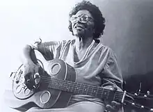 Molton played slide guitar in open D tuning.[11] Her guitar technique was described as "bottleneck" because, like many country blues players, she slid a broken bottleneck along the strings to make chord changes.[6] Reagon said that the bottleneck technique created a wailing sound and that her fingering created "a warbled tone". Molton fingered three to four strings at a time and played thirds and sevenths together, producing what Reagon called "a chordal wail with a buzz effect, a quality present in traditional African music."[4]