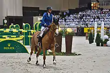 In April 2016, she won the Antwerp leg of the Global Champions Tour[25] ahead of another French rider, Simon Delestre, thanks to a triple clear round.[26] In June, Flora and her rider fell on an oxer during the jump-off at the CSIO5* (5-star international Olympic jumping competition) in Rotterdam.[27] Extensive veterinary examinations reveal no injuries or health problems, allowing Flora de Mariposa to remain in contention for the 2016 Summer Olympics.[28] The pair will compete at the Rio Olympics,[29] with the mare arriving on South American soil on the night of Sunday August 7.[30] Representing a reasonable medal chance for France,[31] she suffered a bout of colic on the evening of Friday August 12,[32] but recovered the following day.[33] During qualifying, the mare and her rider fell on an oxer, eliminating Pénélope Leprevost and Flora de Mariposa from the individual classes.[34] The mare and her rider nevertheless took part in France's team gold medal.[35]