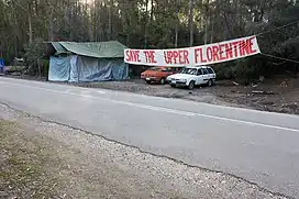 In 2011, community activism and environmental civil disobedience were continuing in the Upper Florentine with over 80 arrests being carried out in the area in 2010.[6] Protesters utilised obstructionist techniques, such as blockading structures attached to tree sits to stand in the way of logging operations and prevent forest harvester equipment from moving into the valley. The conservationist camp was manned by environmental campaigners, including the organisation Still Wild Still Threatened.[7] In 2013, the Upper Florentine was protected from logging when the area was added to the Tasmanian Wilderness World Heritage Area.[8]