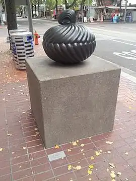 Mark Calderon's Floribunda (1998) is a bronze sculpture installed at the southwest corner of the intersection of Southwest 5th Avenue and Stark Street in the Portland Transit Mall. The sculpture, part of a series of works created by Calderon in the 1990s based on hairstyles found in 12th- and 13th-century Japanese Buddhist sculpture,[1] measures 23 inches (58 cm) x 23.5 inches (60 cm) x 23.5 inches (60 cm).[2] Floribunda is the only free-standing piece from the series, but according to the Regional Arts & Culture Council, which administers the work, "much of his work from that period was inspired by religious images of ancient cultures and consisted of larger than life-size pieces—head-like in form—meant to be displayed on a wall".[2] The sculpture is part of the City of Portland and Multnomah County Public Art Collection courtesy of the Regional Arts & Culture Council.[3]
