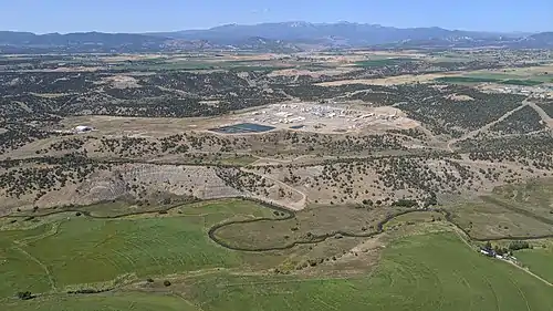 Florida River and Williams–Ignacio Plant (a petroleum and gas processing facility) near Durango, aerial view on takeoff from Durango–La Plata County Airport