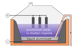 The modern version of the process uses steel containers as cathodes, while blocks of carbon are used as anodes. The carbon electrodes are similar to those used in the electrolysis of aluminium. An earlier version of fluorine production process, by Moissan, uses platinum group metal electrodes and carved fluorite containers. The voltage for the electrolysis is between 8 and 12 volts.[36]