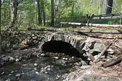 The Negro Brook Bridge, located at about 43°02′33.5″N 72°41′35.6″W / 43.042639°N 72.693222°W, formerly carried State Forest Road across Negro Brook, right near an entrance to Townshend State Forest. This bridge has a span of 14.5 feet (4.4 m) and a height of 5 feet (1.5 m). Like the other bridges, its width is limited to a single modern vehicular travel lane.[2] It is located just upstream of the current State Forest Road bridge.