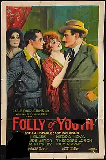 Folly of Youth is a 1925 American independent silent crime drama film directed by Paul Hurst and starring Gaston Glass, Hedda Nova and Noah Beery.[1] It takes place during the era of Prohibition.