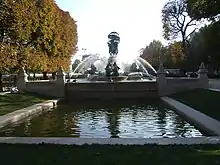 The Fontaine de l'Observatoire is a monumental fountain located in the Jardin Marco Polo, south of the Jardin du Luxembourg in the 6th arrondissement of Paris, with sculpture by Jean-Baptiste Carpeaux. It was dedicated in 1874. It is also known as the Fontaine des Quatre-Parties-du-Monde, for the four parts of the world embodied by its female figures, or simply the Fontaine Carpeaux.