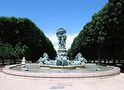 The avenue du Luxembourg project called for the creation of two new squares, with ornamental lamps and columns, statues, and a fountain. The fountain was located on the tree-lined axis between the Observatoire de Paris and the Palais du Luxembourg. The sculpture of the fountain was supposed to be related to the observatory, and instructions of Davioud to the sculptor were simply not to block the view of the domed observatory or the palace.[2]