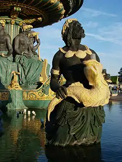 The Maritime Fountain, to the south, closer to the River Seine, represents the maritime spirit of France. Large semi-nude figures supporting the vasque represent the Mediterranean Sea and the Atlantic Ocean. Other figures beneath the vasque represent the industries of the sea; coral, fish, shells and pearls.[4]