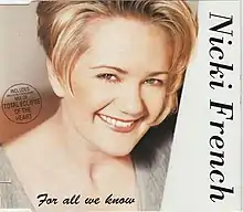 English singer Nicki French released a cover of "For All We Know" in 1995, which was included on her debut album, Secrets (1995). The song peaked at No. 31 in Scotland, No. 42 on the UK Singles Chart and No. 89 in Australia. A music video was also produced to promote the single.