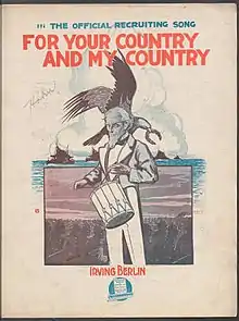 "For Your Country and My Country" is a World War I era song released in 1917. Lyrics and music were written by Irving Berlin.[1] The song was published by Waterson, Berlin & Snyder, Co. of New York, New York. Artist Albert Wilfred Barbelle designed the sheet music cover. It features Uncle Sam playing a snare drum with an eagle on his shoulder. In the background are ships sailing, and below are troops marching. Above the title, it reads, "The Official Recruiting Song."[2] The song was written for voice and piano,[3][4] along with chords for guitar, ukulele, and banjo.[5]