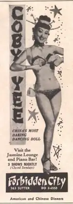 Coby Yee was an exotic dancer billed as "China's Most Daring Dancing Doll". Yee later bought The Forbidden City club from Charlie Low when he retired in 1962 and managed the club until it closed in 1970.[31]
