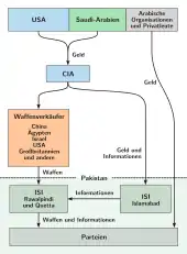 - ↑ According to Milton Bearden, former CIA chief in charge of the Afghan department, "The Saudi dollar-for-dollar match with the US taxpayer was fundamental to the success [of the ten-year engagement in Afghanistan]" (from Milton Bearden Interview. PBS Frontline.)