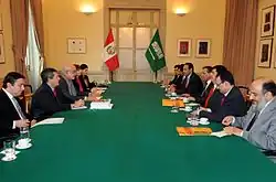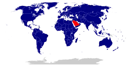Foreign relations of Saudi Arabia are the diplomatic and trade relations between Saudi Arabia and other countries around the world. The foreign policy of Saudi Arabia is focused on co-operation with the oil-exporting Gulf States, the unity of the Arab World, Islamic solidarity, and support for the United Nations.[1] In practice, the main concerns in recent years have been relations with the US, the Saudi Arabian–led intervention in Yemen, the Israeli–Palestinian conflict, Iraq, the perceived threat from the Islamic Republic of Iran, and the effect of oil pricing. Saudi Arabia contributes large amounts of development aid to Muslim countries. From 1986 to 2006, the country donated £49 billion in aid.[2][3][4]