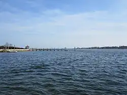 The tidal portion of the river is 3.2 nautical miles long that ends abruptly at Montauk Highway which serves as a dam between the river towns of Mastic and Moriches New York.