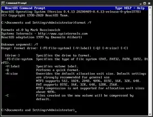 format command on ReactOSThe ReactOS implementation is based on a free clone developed by Mark Russinovich for Sysinternals in 1998. It is licensed under the GPL.[22] It was adapted to ReactOS by Emanuele Aliberti in 1999 and supports FAT, FAT32, FATX, EXT2, and BtrFS filesystems.