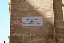 During the French occupation of Malta, the bakery was used to produce bread for the French garrison, and it was heavily guarded during the blockade of 1798–1800.[28] At this point, the street where the bakery was located, originally called Strada San Giovanni Battista,[29] was renamed Rue des Fours after the bakery.[30] It was later known as Strada Forni in Italian during the early British period,[29] and since 1926 it has been called Old Bakery Street. It is known as Triq il-Fran or Triq l-Ifran in Maltese, but it is still commonly called Strada Forni by Valletta residents.[31][32] This means that the bakery gives the name to a main street in the capital Valletta.[8]