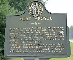 Near here, on the West bank of the Ogeechee River, Fort Argyle was built in 1733, to command one of the main passes by which enemy Indians had recently invaded South Carolina, and to give protection to the settlers of Savannah from anticipated raid by Spaniards from Florida.