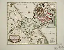 A 1677 map, still using the Dutch name of Bourg Louis, shows a watchtower, some small batteries and a miniature star-shaped fort on Morne Cépérou. A report that year says the small (peu spacieux) fort had walls that were so thin they were disintegrating.[13] In 1689 new fortifications for the town were laid out by Sébastien Le Prestre de Vauban, the king's engineer.[4] Vauban's fortifications were built between 1689 and 1693.[14] The original Fort Cépérou remained, surrounded by the much more extensive ramparts of Vauban.[15]
