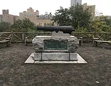 Fort Clinton was a stone-and-earthworks fortification on an elevation within what is now Central Park in New York City. It was built in 1814 near the present line of 107th Street, slightly west of Fifth Avenue. According to maps of the time, Fort Clinton was the easternmost of a connected series of forts, connected to Nutter's Battery on the west by earthworks and a gatehouse over the Old Post Road at the bottom of McGowan's Pass.[2] Fort Clinton and Nutter's Battery were commanded from a third fort at the top of the pass, Fort Fish, which had a sweeping view of Long Island Sound, northern Manhattan, and Westchester County. Fort Fish was across the road from Fort Clinton and connected to Nutter's Battery by another line of earthworks.[3][4]