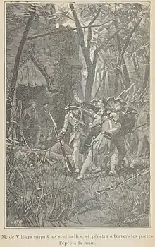 On 30 July, Captain Edward Ward, commandant at Fort Granville, took all but 24 men out of the fort to protect settlers in Sherman's Valley, leaving Lieutenant Armstrong in command.[6] The Native Americans estimated the number of men remaining in the fort, and on 2 August 100 warriors, along with 55 Frenchmen[6][9] led by Francois Coulon de Villiers[10] (not his brother, Louis Coulon de Villiers, as is often written incorrectly) attacked the fort .[1]