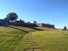 The main access is through a gate on the south side, through a drawbridge over the moat, which is currently backfilled. There are secondary accesses on the East and West sides, all leading through tunnels to the Field-of-Arms.[1]