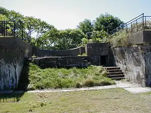 Prior to the American entry into World War II in December 1941, the fort also included many new temporary structures as it had previously in World War I.[1] In addition, the fort's complement increased to around 800 men, including 14 officers and 4 NCOs.[1] In 1942 the fort's 10-inch guns were scrapped; they were superseded by the long-range guns of Fort Duvall and Fort Ruckman, soon to be augmented by Battery Murphy at the East Point Military Reservation. Battery Terrill's 6-inch disappearing guns followed in 1943, leaving only Batteries Whipple and Williams active. That year Anti-Motor Torpedo Boat Battery (AMTB) 943 was built, with two fixed and two towed 90 mm guns.[1][5]