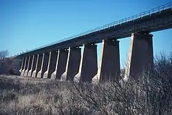 It is a plate-girder design bridge, 1,500 feet (460 m) in length, built by the Atchison, Topeka & Santa Fe Railway. It consists of fifteen 100 feet (30 m) Class AA Deck Plate Girders supported by 14 concrete piers and two concrete winged abutments. It rises 77 feet (23 m).[2]