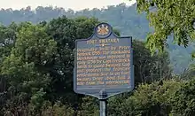 In 1755, during the French and Indian War, marauding Indians allied with the French attacked European settlers along the Blue Mountains of Pennsylvania. Several of these attacks occurred near the Swatara Gap area. Peter Hedrick and other Swatara Gap area settlers fortified Hedrick's farmstead by building a log-walled stockade around the structure. This was the beginning of Fort Swatara.[1][2] On January 25, 1756, Captain Frederick Smith and a company of 50 militiamen received orders from Robert Hunter Morris, deputy governor of Colonial Pennsylvania, to take posts at Swatara Gap. Capt. Smith's orders were to occupy the existing fortification at Hedrick's farmstead and reinforce it if necessary. Smith's troops erected a military-style log blockhouse and magazine shed for ammunition storage and surrounded the structures with a sturdy log stockade.[3][4]