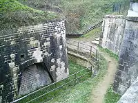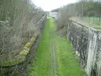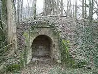 More imposing than the north battery, the south battery was planned to cover the Maron road, taking the valley of the Moselle in enfilade and facing the Bois l'Eveque. It lies to the southeast of the village. 48°39′27″N 5°58′47″E / 48.65750°N 5.97972°E, 320 meters altitude. Like the north battery, the south battery was laid out in the form of a V. The south battery was not reinforced with concrete and retains its stone construction, with the exception of a concrete barracks added on the south side in 1890. It was planned to receive a 75mm gun, which was never installed. The entry was equipped with a rolling bridge by Th. Pilter that could be laterally displaced.[9] The southern battery was used by the National School of Applied Geology and Mineral Exploration (École Nationale Supérieure de Géologie Appliquée et de Prospection Minière) in Nancy to store a radioactive mineral collection.