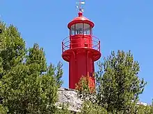 Work on installing the lighthouse and lodgings for the lighthouse keepers on the upper battery of the fort began on 12 November 1895. It began to operate on 15 September 1896 with a fixed red light beacon using a 6th-order dioptric-catadioptric Fresnel lens. The tower is cylindrical and made of iron, with vertical reinforcing strips and was originally painted white. It is 7 metres high and the light is at an altitude of 35 metres.[4][5][6]