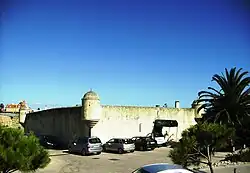 The fort was begun on 5 April 1642 (from an inscription over the portico), and completed in 1643, initially named Forte de São Teodósio (Fort of Saint Theodosius), under the supervision of António Luís de Meneses, governor of the Fort of Cascais.[1][2] It was likely named in honor of the first male heir of King John IV of Portugal.[1][3] This first plan of the fort was elaborated by architect Mateus do Couto, at which time it was referred to as Forte de Santo António da Cruz da Assubida.[1][3][4] During the 17th century, the port consisted of a long battlement, where the artillery was organized towards the east and southern facades.[1] Along the western wall, oriented toward the land, were barracks. In the middle of the building was the main gate, where the intermediary courtyard allowed access to many of the fort's spaces: to the left, the first division served as quarters and kitchen, and in front, the main battery emplacement; from an eight-degree staircase along the guardhouse wall, troops could access to the a floor over the quarters, which was used by the fusiliers; and the angular parapets, along the northern and western orientations of the fort, which acted as the main defensive battery.[1][3]