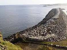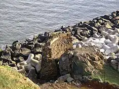 In the 20th century, between the 1950s and 1960s, the construction of the northern protective pier by American military forces in order to help shelter offloading, resulted in further investigation of the fort's ruins. A compromise was signed between the Americans and Portuguese to permit the construction of the dock, while reconstructing the old fort. Yet, unable to fulfill this compromise, the remains of the fort was used to support the arriba at the end of the bay, between Chagas and Ribeira de Beljardim, sometime during the 1960s.[9] Little remains of the vestiges except some portions of the rock used in the walls. The ruins are neither classified or protected by the national or regional registry, nor included in the tourist itineraries published by the city. Local tradition suggest that the royal coat-of-arms from the fort was used in the construction of the municipal council hall of Praia, although unproven.