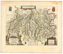 The Fossa Eugeniana or Spanish Rhine-Maas canal [1] was a large-scale ambitious project of the Spanish-Dutch Eighty Years' War planned by the then Spanish regent in Brussels, Isabella Clara Eugenia, after whom it was named, during the years 1626–1630. It consisted of a fortified canal intended to blockade the United Provinces and to divert trade from the Rhine near Rheinberg just south of Wesel and reroute it to Venlo on the Maas, in Spanish territory.[2] The Spanish Rhine-Maas canal had military importance, when at the time Spanish garrisons in north-western Germany reached their maximum extent, amounting to around fifty fortresses and forts.[3] It was to be 25 metres (82 ft) wide, 1.4 metres (4.6 ft) deep and 45 kilometres (28 mi)[4] long. The Fossa Eugeniana was never finished. A 5.7 km section west of Geldern is in use as drainage canal. It is known under the name Grift.