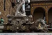 The representation of Neptune in the Renaissance is particularly interesting because unlike many of the other Olympian deities, there were no surviving classical sculptures depicting Neptune available to artists in the Renaissance.[13] This meant that the representation of Neptune was based upon the artist's personal interpretation of what he should look like. Because of this, the Italian representation of Neptune was different than that of Greek tradition. Unlike Neptune in Greek mythology, the Italian interpretation of Neptune was more human than god, much like Hercules.[13] Over the course of the fifteenth century three main representations of Neptune emerged: static which was popular between the 1530s through 1560s, dynamic which was popular between 1504 and 1566, and synthesized which was an amalgamation of the two styles.[13] The Neptune in Ammannati's Fountain was built in a static style, standing atop his chariot of horses. The representation of Neptune in static style was popular in Florence at the time and was frequently used in fountains; however, there are two elements worth noting that made Ammannati's representation of Neptune slightly different than others. Ammannati's Neptune is wearing a crown and holding a lash in his right hand. Both the crown and the lash were a reference to earthly rulers, making this specific representation of Neptune symbolic of a contemporary ruler i.e. Cosimo I de' Medici, rather than an Olympian deity.[13]