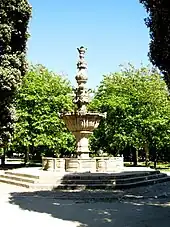 The fountain is located in the Garden of Passeio Alegre, a large, dense garden/park situated on the northern bank and mouth of the Douro River.[1] It is situated at the western limit of the park close to the intersection of Rua D. Luís Filipe and Rua do Passeio Alegre, nearby a Swiss-type Chalet café.[1]