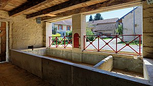 The covered washhouse, of rectangular plan by Renahy, replaced in 1858 circular basins built 25 years earlier. It was built with freestone from Andelarrot and La Malachère, while the trough was built with sand stones from Granges-le-Bourg ou Châtillon-sur-Saône.[1]