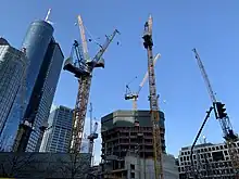 Four, also known as Four Frankfurt, is a major, luxury mixed-use skyscraper project in Frankfurt, consisting of a complex of four skyscrapers under construction.[1] It is located in the area known as the Deutsche Bank triangle in the Innenstadt borough. The tallest skyscraper will have a height of 233 metres (764 ft), making it Europe's largest residential tower by occupied floor space. Germany's largest building, the Commerzbank Tower is larger by building height but not when measured by occupied floor space height. By total building height it is both Frankfurt and Germany's third-tallest building upon its estimated completion in 2023. Dutch star-architect and student of Zaha Hadid, Ben van Berkel has designed and developed the building.[2]