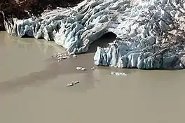 ![]() Terminus of Fourpeaked Glacier with dark-colored sediment issuing from an elongate tunnel in the ice. Photo taken Sept 20, 2006 | |